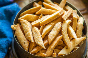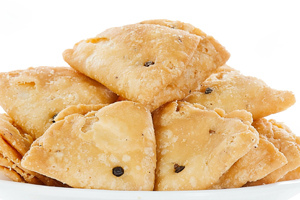 Namak Paray are crispy flaky snacks made by deep frying maida (plain flour). The flour is kneaded using ghee which attributes to its flakiness and sooji (semolina) is added for crispiness. Namak Paray are a very popular snack in India and are always prepared for special occasions and festivals like Diwali & Holi.
