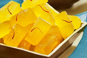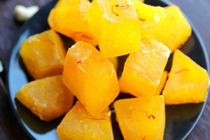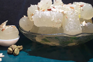 Petha, a translucent soft sweet, is made from white pumpkin, sugar & rosewater, topped with shredded coconuts.