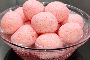 Rasgulla is an Indian syrupy dessert popular in the Indian subcontinent and regions with South Asian diaspora. It is made from ball-shaped dumplings of chhena and semolina dough, cooked in light syrup made of sugar. This is done until the syrup permeates the dumplings.