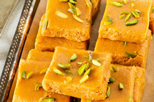 Petha, a translucent soft sweet, is made from white pumpkin, sugar & rosewater, topped with shredded coconuts.