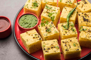 Dhokla, a warm soft and spongy savory gram flour snack cake tempered with spices